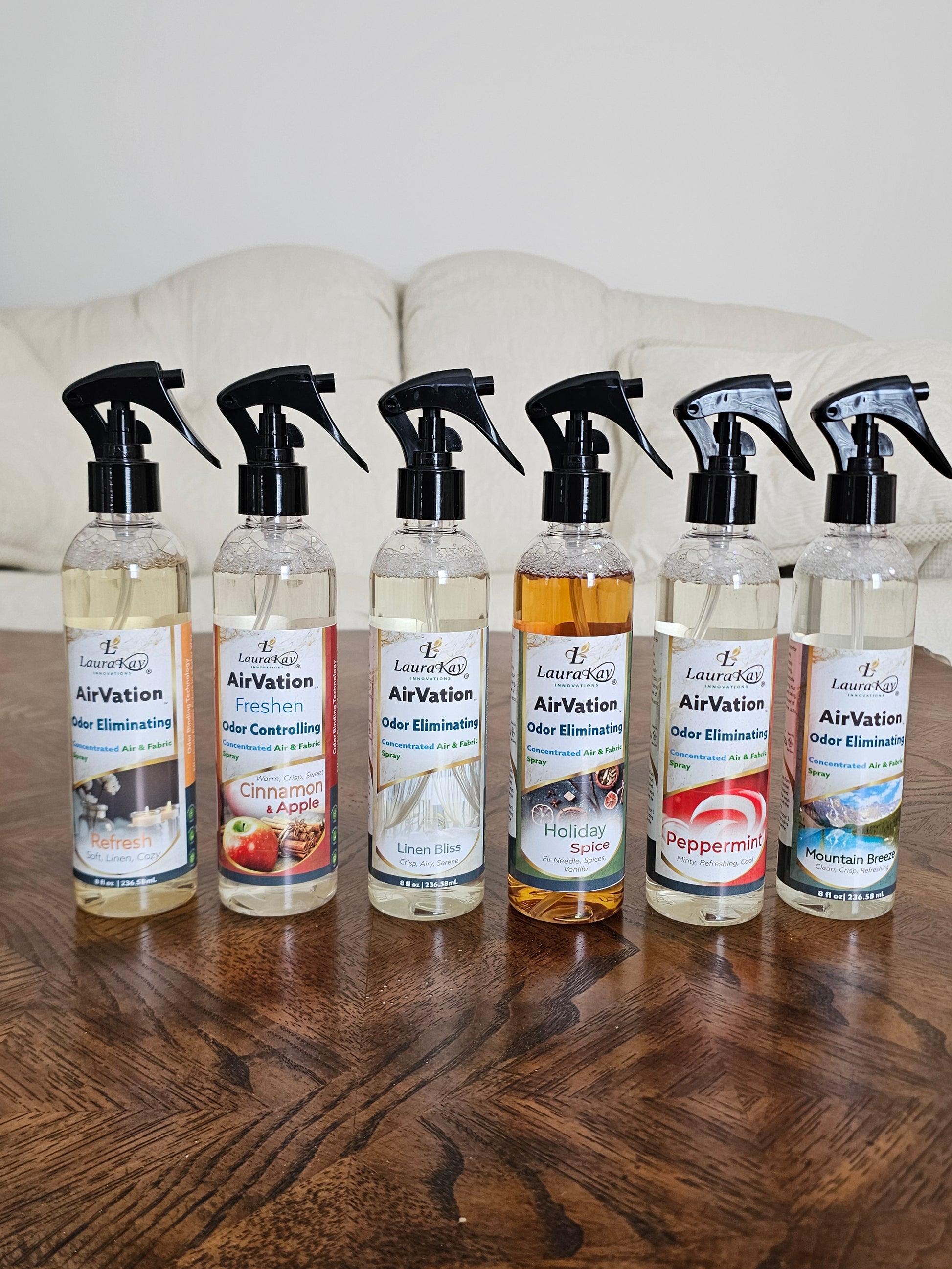 Elevate your odor control strategy with AirVation's thoughtfully assembled Gift Set. This premium collection contains six 8 fl oz bottles of our advanced odor eliminator spray, engineered to work seamlessly on both air and fabric surfaces. The set spans six distinct aromatic profiles—Linen Bliss, Mountain Breeze, Refresh, Cinnamon Apple, Peppermint, and Holiday Spice—allowing you to customize fragrance for any room or season. Each formula combines powerful odor neutralization with refined scent technology, delivering results that exceed standard air fresheners. Presented in an elegant decorative holiday gift box, this set serves as both a sophisticated gift and a comprehensive solution for maintaining fresh, inviting spaces year-round.